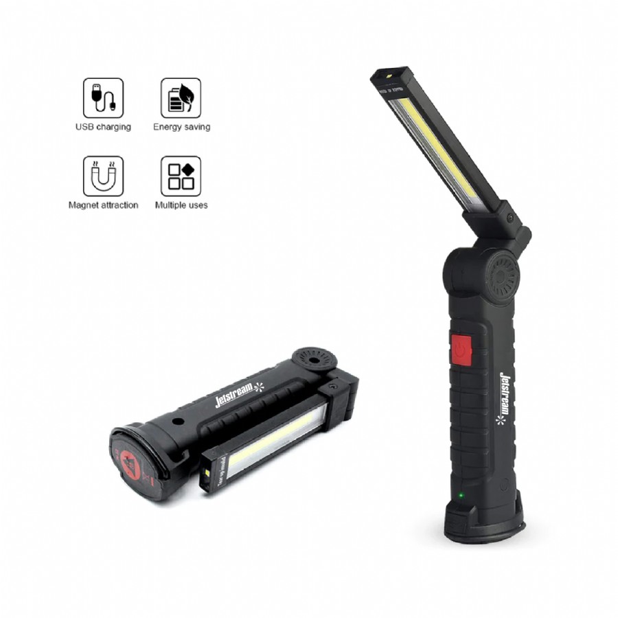 5.5" Long rechargeable worklight. Illuminate any situation with this hands-free area light, designed with a 360-degree foldable head and 450 lumen output. Additional features: Magnetic bottom, a hook for hanging, 5 light modes including red strobe, and a USB port for recharging. Micro USB cable included. Boxed.