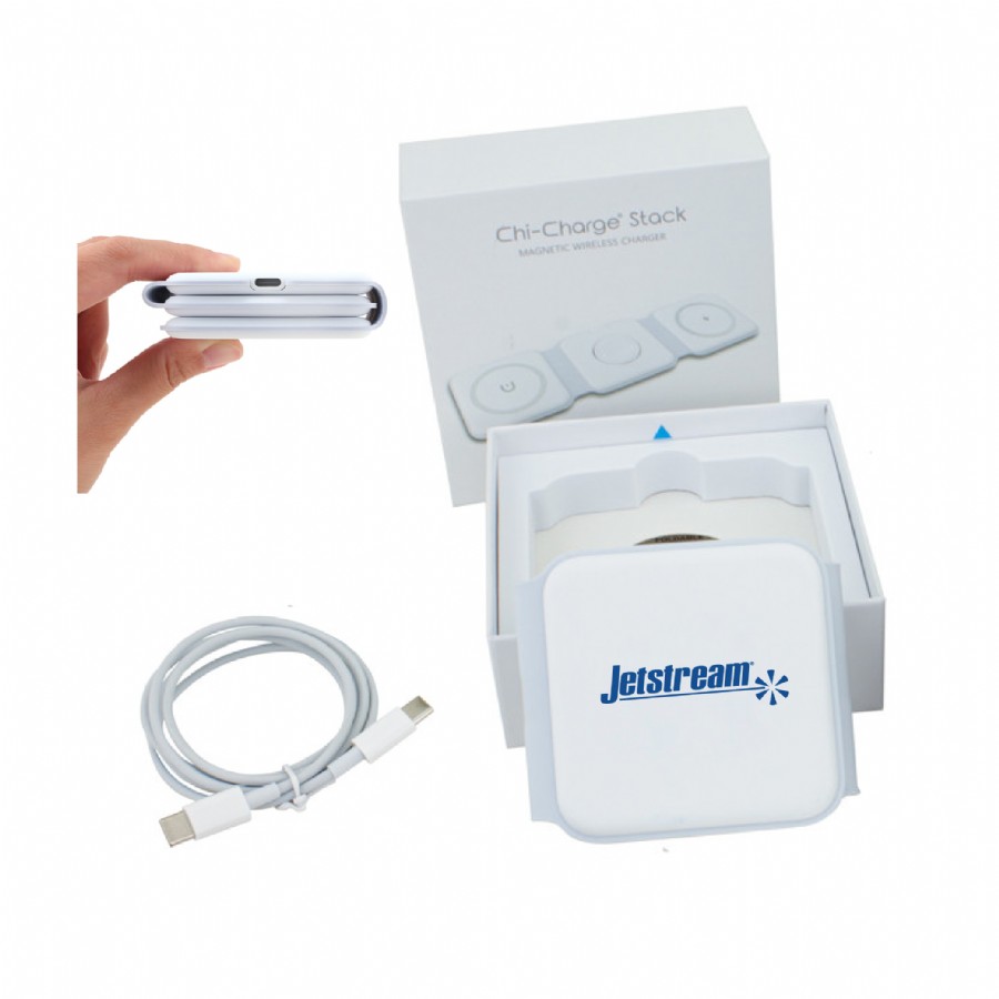 Compact wireless charger for charging up a phone, Apple Watch, and AirPods at the same time. Features a compartment that conveniently stores a USBC-to-USBC cable and a Type-C-to-USB adapter.